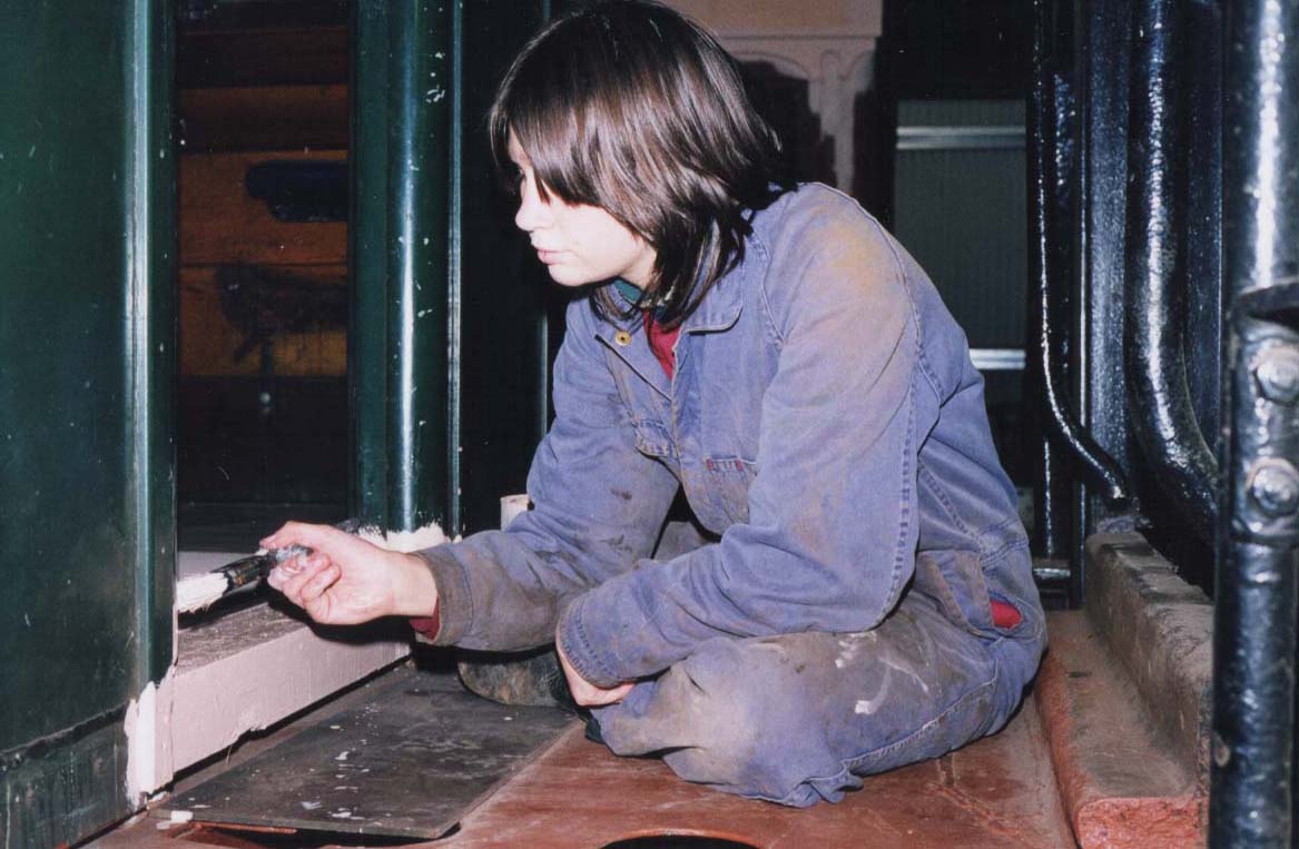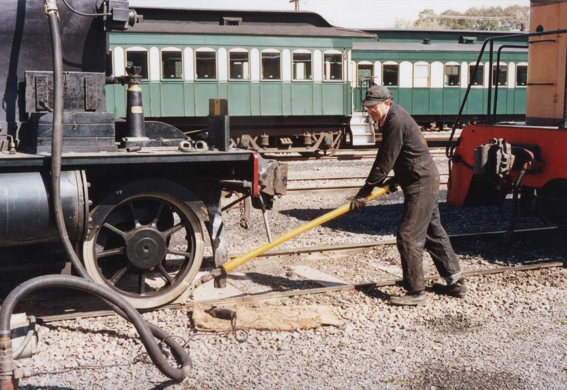| ![]() Trevor Clift carrying out repairs to RedHen 428's cow cathcher | ![]() Kim Critchley cutting up the essential loco lightup wood | ![]() Andrew Gramp - grease into loco 520 (Oct 98) | ![]() Dean Smith cleans out F251's firebox (June 99)