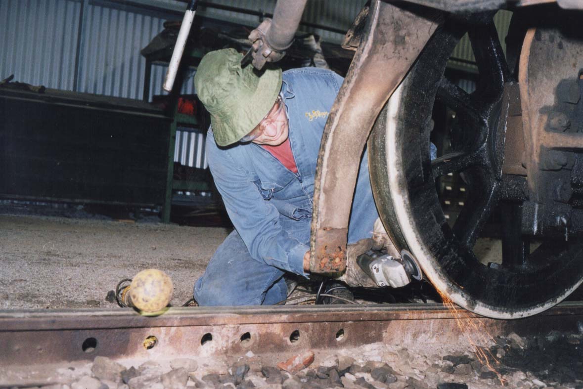 Paul and Ben Greeneklee | ![]() Alan Dale polishing up F251's motion | ![]() John Davidson - reassembling Rx207's main springs | ![]() Geoff Hancock - reaming Rx207's release cock (May 2001) | ![]() Pam Cameron - Sanding the end of car 73 in preparation for painting