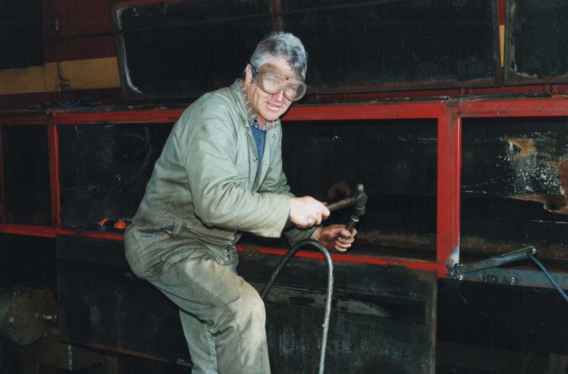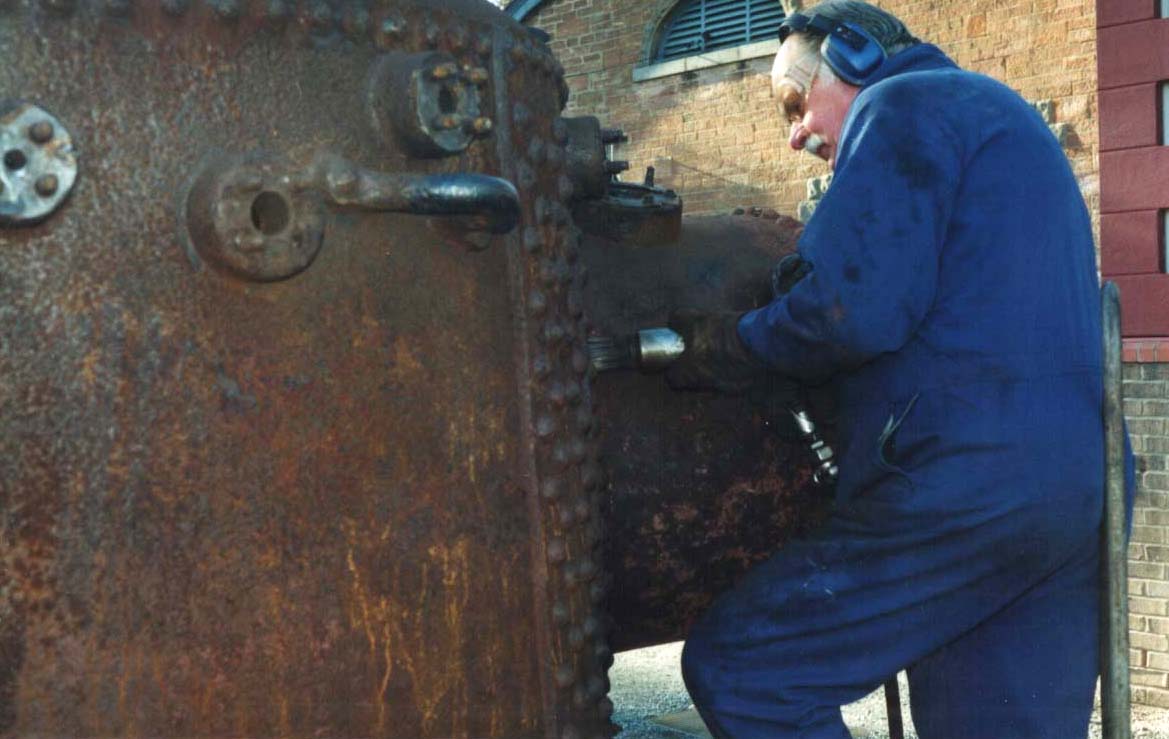 Brown | ![]() Trevor Williams - rubbing down F251's frame ready for painting | ![]() Barry Edwards needle gunning a Ruston and Hornsby boiler being repaired under