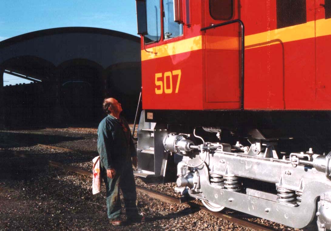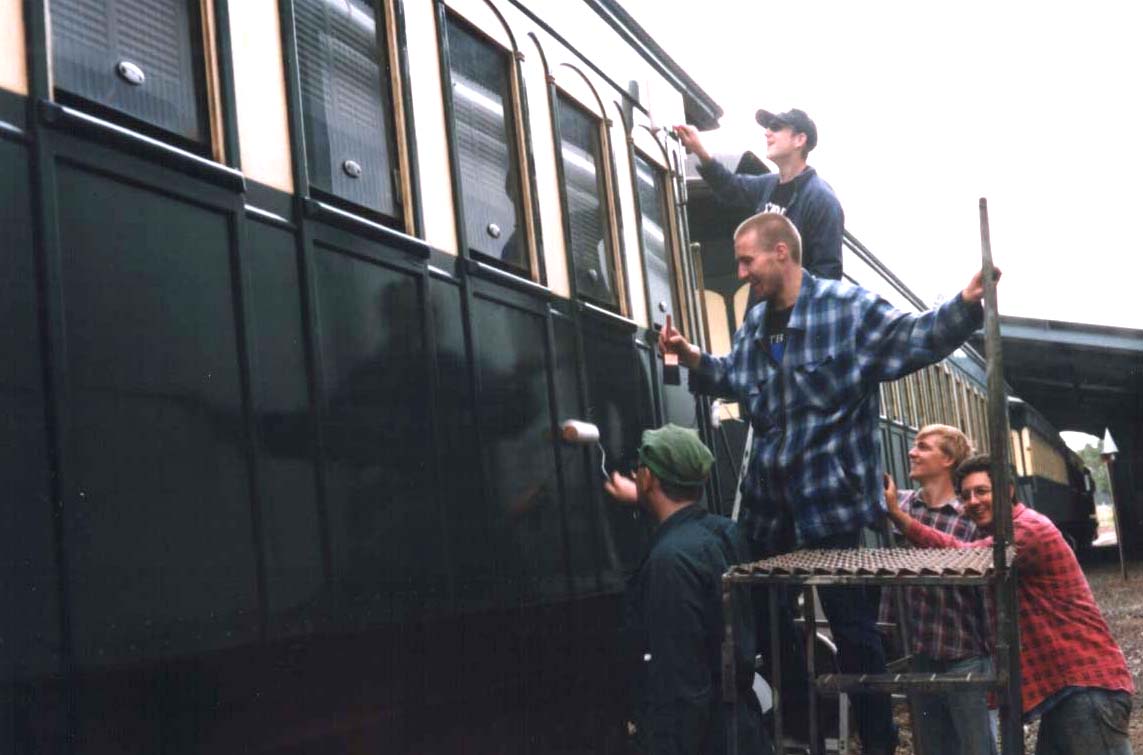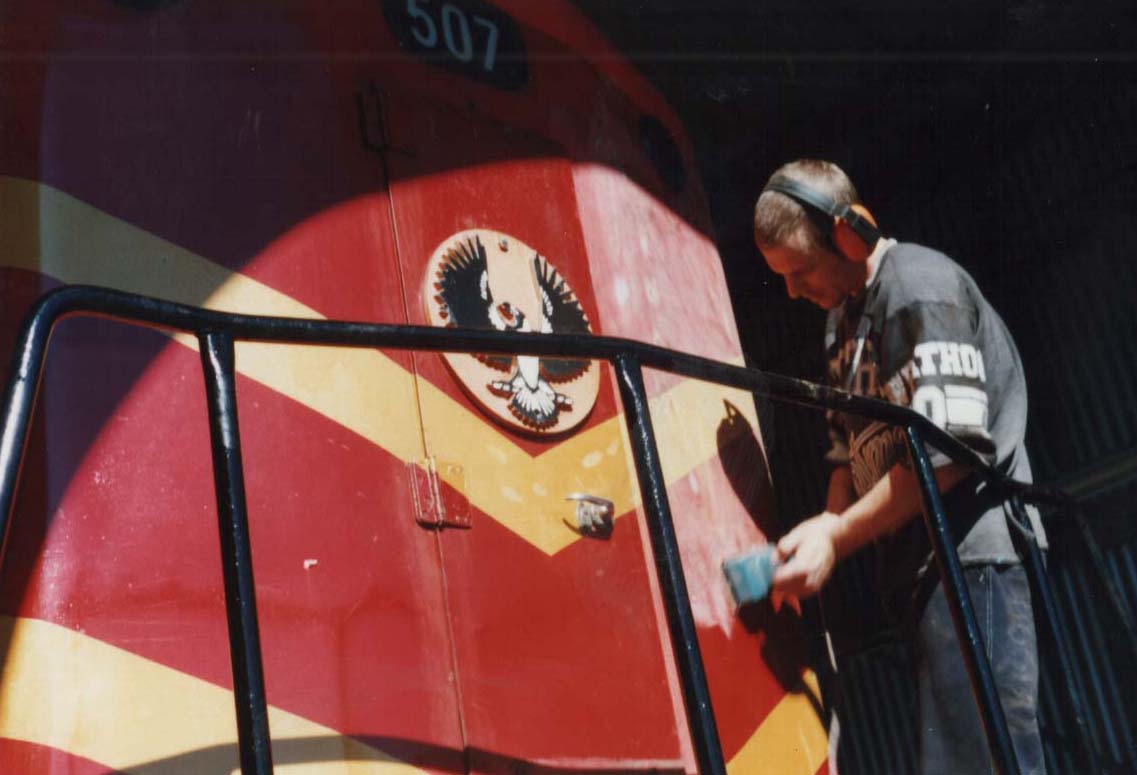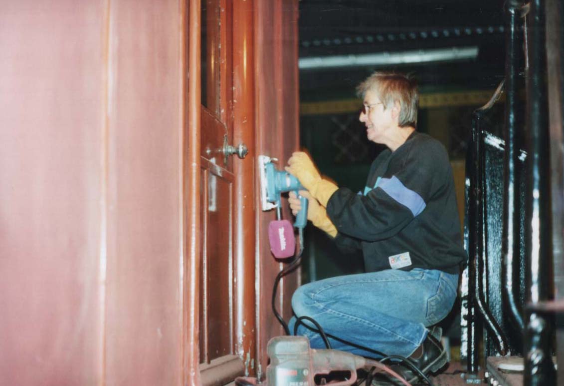 paperwork | ![]() Bob Hughes preparing DE 507 for repainting (July 99) | ![]() .... and Jason Sipos on the 507 job too | ![]() ......whilst Peter Kither works on the battery boxes | ![]() Rex Hoppo admiring his paint work on DE507 | ![]() Doug McKenzie and Peter Kither | ![]() Richard Wilkins - just one of a valuable team of carriage cleaners (Feb